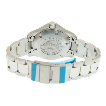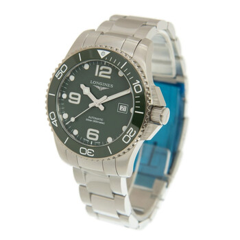 Silver-tone stainless steel case and bracelet. Uni-directional rotating silver-tone stainless steel with an inlaid green ceramic ring bezel. Green dial with luminous black hands and dot hour markers. Arabic numerals appear at the 6, 9 and 12 o'clock positions. Minute markers around the outer rim. Dial Type: Analog. Luminescent hands and markers. Date display at the 3 o'clock position. Longines Calibre L888 Automatic movement, based upon ETA A31.L11, containing 21 Jewels, bitting at 25200 vph, and has a power reserve of approximately 64 hours. Scratch resistant sapphire crystal. Screw down crown. Solid case back. Round case shape, case size: 43 mm, case thickness: 11.90 mm. Band width: 21 mm. Fold over clasp with a safety release. Water resistant at 300 meters / 1000 feet. Functions: date, hour, minute, second. Additional Info: original box, manual (complete accessories). Conquest Series. Dive watch style. Watch label: Swiss Made. Longines Conquest Automatic Green Dial Men's Watch L37824066.