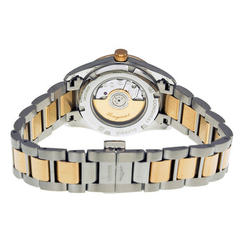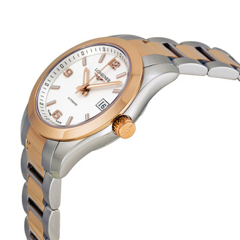 Stainless steel case with a stainless steel bracelet with 18kt rose gold center links. Fixed 18kt rose gold bezel. Silver guilloche dial with luminous rose gold-tone hands and index hour markers. Arabic numerals mark the 6, 9 and 12 o'clock positions. Minute markers around the outer rim. Dial Type: Analog. Luminescent hands and markers. Date display at the 3 o'clock position. Longines calibre L595 automatic movement with a 40 hour power reserve. Scratch resistant sapphire crystal. Screw down crown. Skeleton case back. Case diameter: 29.5 mm. Round case shape. Fold over clasp with a push button release. Water resistant at 30 meters / 100 feet. Functions: date, hour, minute, second. Dress watch style. Longines Conquest Automatic Silver Dial Ladies Watch L2.285.5.76.7