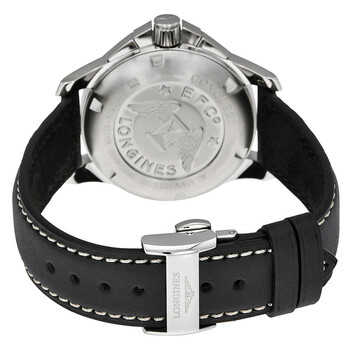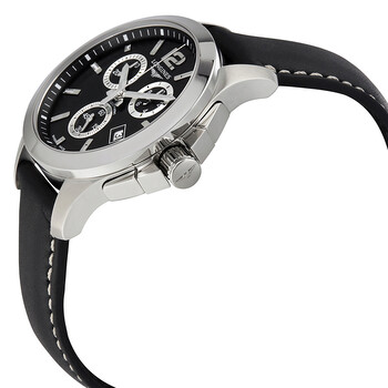 Stainless steel case with a black leather strap. Fixed bezel. Black dial with silver-tone hands and index and Arabic hour markers. Minute markers around the outer rim. Dial Type: Analog. Date display at the 4 o'clock position. Chronograph - three sub-dials displaying: 60 second, 30 minute and 12 hour. Quartz movement. Scratch resistant sapphire crystal. Case size: 36 mm. Round case shape. Water resistant at 300 meters / 1000 feet. Functions: chronograph, date, hour, minute, second. Luxury watch style. Watch label: Swiss Made. Longines Conquest Black Dial Chronograph Ladies Watch L3.379.4.56.3.