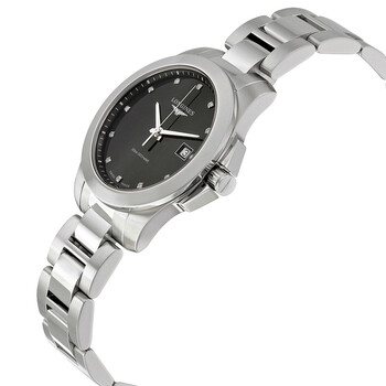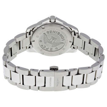Stainless steel case with a stainless steel bracelet. Fixed stainless steel bezel. Black dial with silver-tone hands and diamond hour markers. Minute markers around the outer rim. Dial Type: Analog. Date display at the 3 o'clock position. Quartz movement. Scratch resistant sapphire crystal. Screw down crown. Solid case back. Case size: 36 mm. Case thickness: 9.20 mm. Round case shape. Deployment clasp. Water resistant at 300 meters / 1000 feet. Functions: date, hour, minute, second. Luxury watch style. Watch label: Swiss Made. Longines Conquest Black Dial Diamond Ladies Watch L3.378.4.57.6.