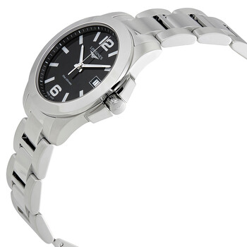 Stainless steel case with a stainless steel bracelet. Fixed stainless steel bezel. Black dial with luminous silver-tone hands and index hour markers. Arabic numerals mark the 6 and 12 o'clock positions. minute markers around the outer rim. Dial Type: Analog. Date display at the 3 o'clock position. Longines calibre L156 quartz movement. Scratch resistant sapphire crystal. Screw down crown. Solid case back. Case size: 34 mm. Round case shape. Band width: 17 mm. Deployment clasp. Water resistant at 300 meters / 1000 feet. Functions: date, hour, minute, second. Dress watch style. Watch label: Swiss Made. Longines Conquest Black Dial Ladies Watch L33774586.