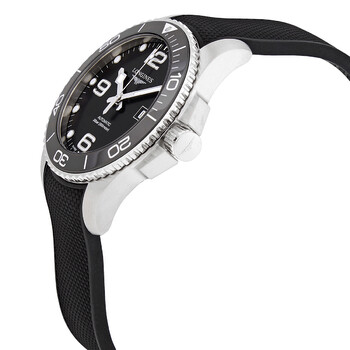 Stainless steel case with a black rubber strap. Uni-directional rotating stainless steel with a black ceramic ring bezel. Black dial with luminous silver-tone hands and dot hour markers. Arabic numerals appear at the 6, 9 and 12 o'clock positions. Minute markers around the outer rim. Dial Type: Analog. Luminescent hands and markers. Date display at the 3 o'clock position. Longines caliber L888 automatic movement with a 64-hour power reserve. Scratch resistant sapphire crystal. Screw down crown. Solid case back. Round case shape. Case size: 43 mm. Band width: 21 mm. Tang clasp. Water resistant at 300 meters / 1000 feet. Functions: date, hour, minute, second. Additional Info: original box, manual (complete accessories). Conquest Series. Luxury watch style. Watch label: Swiss Made. Longines Conquest Black Dial Men's Watch L37824569.