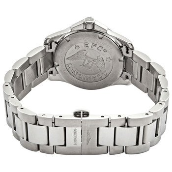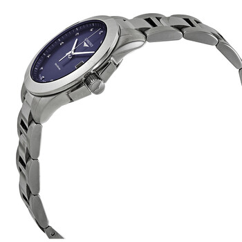 Silver-tone stainless steel case with a silver-tone stainless steel bracelet. Fixed silver-tone stainless steel bezel. Blue sunray dial with silver-tone hands and diamonds hour markers. Minute markers around the outer rim. Dial Type: Analog. Date display at the 3 o'clock position. ETA Caliber 255.412 quartz movement. Scratch resistant sapphire crystal. Screw down crown. Solid case back. Round case shape. Case size: 34 mm. Hidden clasp. Water resistant at 300 meters / 1000 feet. Functions: date, hour, minute, second. Dive watch style. Watch label: Swiss Made. Longines Conquest Blue Sunray Diamond Dial Ladies Watch L3.377.4.97.6.