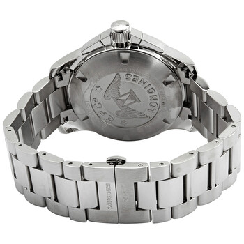 Stainless steel case with a stainless steel bracelet. Fixed stainless steel bezel. Blue dial with silver-tone hands and index hour markers. An Arabic Numeral appears at the 12 o'clock position. Minute markers around the outer rim. Dial Type: Analog. Luminescent hands and markers. Date display between the 4 and 5 o'clock positions. Chronograph - three sub-dials displaying: 60 seconds, 30 minutes, and 12 hours. Longines calibre L688 automatic movement with a 54-hour power reserve. Scratch resistant sapphire crystal. Screw down crown. Solid case back. Round case shape. Case size: 44 mm. Band width: 22 mm. Triple fold over clasp with a safety release. Water resistant at 300 meters / 1000 feet. Functions: chronograph, column wheel, date, hour, minute, small second. Dive watch style. Watch label: Swiss Made. Longines Conquest Chronograph Automatic Blue Dial Men's Watch L3.801.4.96.6.