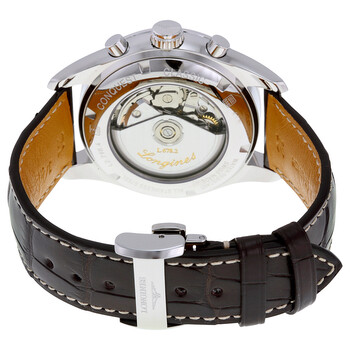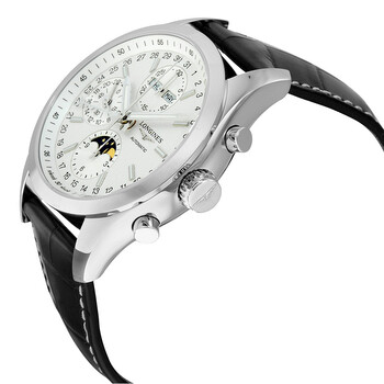 Stainless steel case with a brown (alligator) leather strap. Fixed stainless steel bezel. White dial with luminous silver-tone hands and index hour markers. Date scale. Minute markers around the outer rim. Dial Type: Analog. Luminescent hands. Complete calendar - day of the week and month display center dial. Chronograph - three sub-dials displaying: dual 60 second / 24 hour, dual 12 hour / moonphase and 30 minutes. Longines calibre L678 automatic movement with a 48-hour power reserve. Scratch resistant sapphire crystal. Pull / push crown. Transparent case back. Round case shape. Case size: 42 mm. Case thickness: 14.5 mm. Band width: 21 mm. Fold over clasp with a push button release. Water resistant at 50 meters / 165 feet. Functions: moon phase, chronograph, month, date, day, GMT, second time zone, hour, minute, second, day/night indicator. Sport watch style. Watch label: Swiss Made. Longines Conquest Chronograph Automatic Men's Watch L27984723.