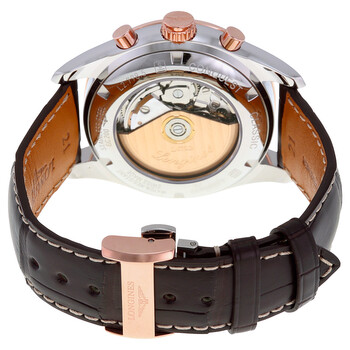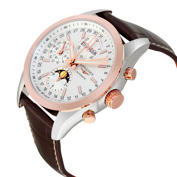 Stainless steel case with a brown alligator leather strap. Fixed rose gold PVD bezel. White dial with luminous rose gold-tone hands and index hour markers. Date scale around an inner ring. Minute markers appear around the outer rim. Dial Type: Analog. Luminescent hands and markers. Perpetual calendar - day of the week and month display below the 12 o'clock position. Chronograph - three sub-dials displaying: combined 60 second and 24 hour, 30 minute and 1/10th of a second. Automatic movement with a 48-hour power reserve. Scratch resistant sapphire crystal. Transparent case back. Case diameter: 42 mm. Case thickness: 14.5 mm. Round case shape. Band width: 21 mm. Deployment clasp. Water resistant at 50 meters / 165 feet. Functions: chronograph, hour, minute, second, perpetual calendar, moonphase. Sport watch style. Watch label: Swiss Made. Longines Conquest Chronograph Automatic White Dial Brown Leather Men's Watch L27985723.