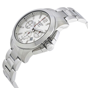 Stainless steel case with a stainless steel bracelet. Fixed stainless steel bezel. Silver dial with luminous silver-tone hands and index hour markers. An Arabic numeral appears at the 12 o'clock position. Minute markers around the outer rim. Dial Type: Analog. Luminescent hands and markers. Date display between the 4 and 5 o'clock positions. Chronograph - three sub-dials displaying: 60 second, 30 minute and 12 hour. Longines calibre ETA A08.L01 automatic movement with a 54-hour power reserve. Scratch resistant sapphire crystal. Screw down crown. Transparent case back. Case size: 44 mm. Round case shape. Band width: 22 mm. Fold over clasp. Water resistant at 300 meters / 1000 feet. Functions: chronograph, date, hour, minute, second. Casual watch style. Longines Conquest Chronograph Automatic Men's Watch L38014766. The Longines, Conquest series features a stainless steel 44mm case, with a fixed bezel, a silver dial and a scratch resistant sapphire crystal. The L38014766 watch, equipped with a 22mm wide stainless steel band and a fold over clasp, makes for a comfortable fit and a stylish timepiece that is sure to complete any man's collection. Water-resistant up to 300 meters / 1000 feet This beautiful wristwatch, powered by a Longines Calibre ETA A08.L01, automatic movement, features chronograph, date, hour, minute, second functions. Finally, all this highlighted by three - 60 second, 30 minute and 12 hour sub-dials along with luminous silver-tone hands, and index markers.