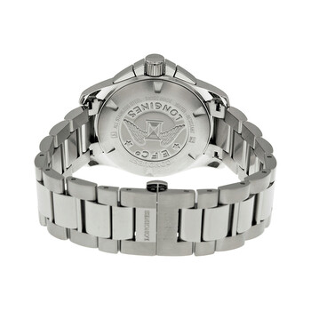 Stainless steel case with a stainless steel bracelet. Fixed stainless steel bezel. Black dial with luminous silver-tone hands and index hour markers. Arabic numeral appears atthe 12 o'clock position. Minute markers. 1/100th markers around the outer rim. Dial Type: Analog. Luminescent hands and markers. Date display at the 4 o'clock position. Chronograph - three sub-dials displaying: 60 second, 30 minute and 12 hour. Longines calibre L440 quartz movement. Scratch resistant sapphire crystal. Screw down crown. Solid case back. Round case shape. Case size: 41 mm. Case thickness: 15.15 mm. Band width: 22 mm. Fold over deployment clasp. Water resistant at 300 meters / 1000 feet. Functions: chronograph, date, hour, minute, second. Conquest Series. Dress watch style. Watch label: Swiss Made. Longines Conquest Chronograph Black Dial Men's Watch L37004566.