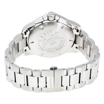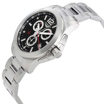 Stainless steel case with a stainless steel bracelet. Fixed stainless steel bezel. Black dial with luminous silver-tone hands and index hour markers. An Arabic numeral appears at the 12 o'clock position. Minute markers. 1/100th second markers around the outer rim. Dial Type: Analog. Luminescent hands and markers. Date display at the 4 o'clock position. Chronograph - three sub-dials displaying: 60 second, 30 minute and 12 hours. Longines calibre 440 quartz movement. Scratch resistant sapphire crystal. Screw down crown. Solid case back. Case size: 44 mm. Case thickness: 11.5 mm. Round case shape. Band width: 22 mm. Deployment clasp. Water resistant at 300 meters / 1000 feet. Functions: chronograph, date, hour, minute, second. Luxury watch style. Watch label: Swiss Made. Longines Conquest Chronograph Black Dial Stainless Steel Men's Watch L38004566.