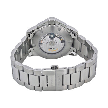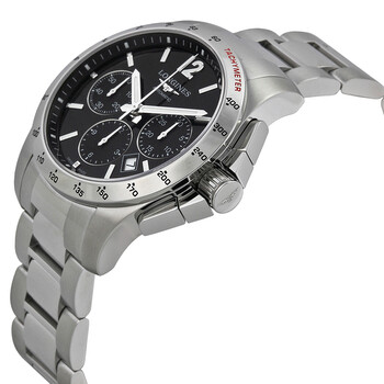 Stainless steel case with a stainless steel bracelet. Fixed stainless steel bezel with tachymeter scale. Black dial with silver-tone hands and stick hour markers. Arabic numeral marks the 12 o'clock position. Minute markers around the outer rim. Dial Type: Analog. Luminescent hands and markers. Date display between 4 and 5 o'clock positions. Chronograph - three sub-dials displaying: 60 second, 30 minute and 12 hour. Automatic movement with 54 hour power reserve. Scratch resistant sapphire crystal. Pull / push crown. Skeleton case back. Case diameter: 41 mm. Case thickness: 14 mm. Round case shape. Deployment clasp with push button. Water resistant at 50 meters / 165 feet. Functions: chronograph, date, hour, minute, second. Dress watch style. Watch label: Swiss Made. Longines Conquest Chronograph Black Dial Stainless Steel Men's Watch L27434566.