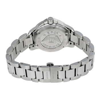 Stainless steel case with a stainless steel bracelet. Fixed stainless steel bezel. Blue dial with silver-tone hands and index hour markers. An Arabic numeral appears at the 12 o'clock position. Minute markers around the outer rim. Dial Type: Analog. Luminescent hands and markers. Date display at the 4 o'clock position. Chronograph - three sub-dials displaying: 60 second, 30 minute and 1/10th of a second. Longines calibre L538 quartz movement. Scratch resistant sapphire crystal. Solid case back. Case size: 36 mm. Round case shape. Deployment clasp with a push button release. Water resistant at 300 meters / 1000 feet. Functions: chronograph, date, hour, minute, second. Luxury watch style. Watch label: Swiss Made. Longines Conquest Chronograph Blue Dial Unisex Watch L3.379.4.96.6.
