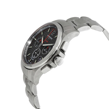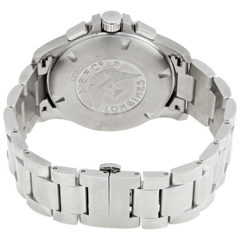 Stainless steel case with a stainless steel bracelet. Fixed stainless steel bezel. Carbon fiber dial with luminous grey hands and index hour markers. An Arabic numeral appears at the 12 o'clock position. Arabic numeral minute markers (at 5 minute intervals). Minute markers around the outer rim. Dial Type: Analog. Luminescent hands and markers. Date display between the 4 and 5 o'clock positions. Chronograph - three sub-dials displaying: 60 second, 30 minute and 12 o'clock. Caliber L288 quartz movement. Scratch resistant sapphire crystal. Pull / push crown. Solid case back. Round case shape. Case size: 44 mm. Case thickness: 12.5 mm. Band width: 21 mm. Fold over clasp with a push button release. Water resistant at 50 meters / 164 feet. Functions: chronograph, date, hour, minute, second. Conquest Series. Dress watch style. Watch label: Swiss Made. Longines Conquest Chronograph Quartz Men's Watch L37274666.