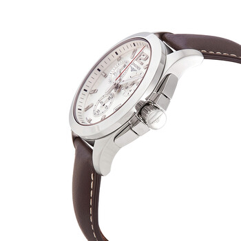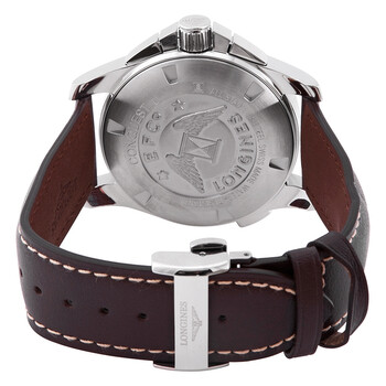 Stainless steel case with a brown leather strap. Fixed stainless steel bezel. Silver dial with luminous silver-tone hands and index hour markers. An Arabic numeral appears at the 12 o'clock position. Minute markers around the outer rim. Dial Type: Analog. Luminescent hands and markers. Date display at the 4 o'clock position. Chronograph - three sub-dials displaying: 60 second, 30 minute and 1/10 second. Longines calibre L442 quartz movement. Scratch resistant sapphire crystal. Screw down crown. Solid case back. Round case shape. Case size: 41 mm. Case thickness: 15.15 mm. Band width: 21 mm. Deployment clasp. Water resistant at 300 meters / 1000 feet. Functions: chronograph, date, hour, minute, second. Conquest Series. Dive watch style. Watch label: Swiss Made. Longines Conquest Chronograph Quartz Silver Dial Men's Watch L3.702.4.76.5.