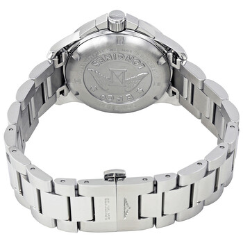 Stainless steel case with a stainless steel bracelet. Fixed stainless steel bezel. Silver dial with silver-tone hands and index hour markers. An Arabic numeral appears at the 12 o'clock positions. Minute markers around the outer rim. Dial Type: Analog. Date display at the 4 o'clock position. Chronograph - three sub-dials displaying: 60 second, 30 minute and 1/10th of a second. Quartz movement. Scratch resistant sapphire crystal. Screw down crown. Solid case back. Case size: 36 mm. Case thickness: 12 mm. Round case shape. Deployment clasp. Water resistant at 300 meters / 1000 feet. Functions: chronograph, date, hour, minute, second. Luxury watch style. Watch label: Swiss Made. Longines Conquest Chronograph Silver Unisex Watch L33794766.