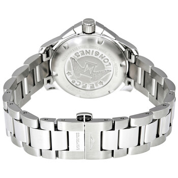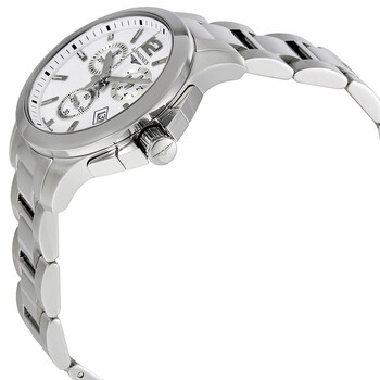 Stainless steel case with a stainless steel bracelet. Fixed stainless steel bezel. White dial with silver-tone hands and index hour markers. An Arabic numeral appears at the 12 o'clock position. Minute markers around the outer rim. Dial Type: Analog. Date display at the 4 o'clock position. Chronograph - three sub-dials displaying: 60 second, 30 minute and 1/10th of a second. Longines Calibre L538 quartz movement. Scratch resistant sapphire crystal. Solid case back. Round case shape. Case size: 36 mm. Fold over clasp with a push button release. Water resistant at 300 meters / 1000 feet. Functions: chronograph, date, hour, minute, second. Conquest Series. Dress watch style. Watch label: Swiss Made. Longines Conquest Chronograph White Dial Unisex Watch L33794166.