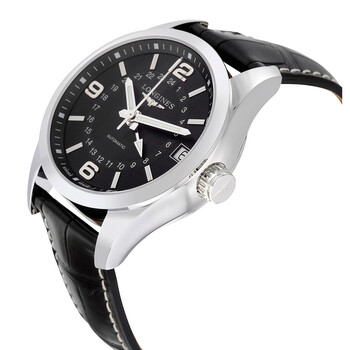 Stainless steel case with a black (alligator) leather strap. Fixed stainless steel bezel. Black dial with luminous silver-tone hands and index hour markers. Arabic numerals appear at the 6, 9 and 12 o'clock positions. 24 hour markers. Minute markers around the outer rim. Dial Type: Analog. Luminescent hands and markers. Date display at the 3 o'clock position. Longines calibre L704.2 automatic movement, based upon ETA A07.171, containing 24 Jewels, bitting at 28800 vph, and has a power reserve of approximately 48 hours. Scratch resistant sapphire crystal. Transparent case back. Round case shape. Case size: 42 mm. Band width: 21 mm. Deployment clasp. Water resistant at 50 meters / 165 feet. Functions: date, GMT, second time zone, hour, minute, second. Conquest Classic Series. Casual watch style. Watch label: Swiss Made. Longines Conquest Classic Automatic Black Dial Black Alligator Men's Watch L27994563.