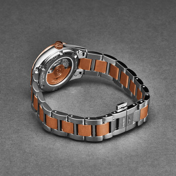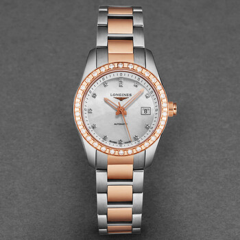 Stainless steel case with a two-tone (gold-tone and silver-tone) stainless steel and 18kt pink gold bracelet. Fixed 18kt pink gold diamond set bezel. White mother of pearl dial with gold-tone hands and diamond hour markers. Minute markers around the outer rim. Dial Type: Analog. Luminescent hands. Date display at the 3 o'clock position. Longines Calibre L595/592 automatic movement with a 40-hour power reserve. Scratch resistant sapphire crystal. Transparent case back. Case size: 29.50 mm. Round case shape. Deployment clasp. Water resistant at 50 meters / 165 feet. Functions: date, hour, minute, second. Dress watch style. Watch label: Swiss Made. Longines Conquest Classic Automatic Diamond Ladies Watch L2.285.5.88.7.