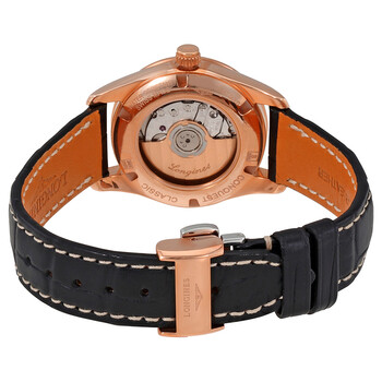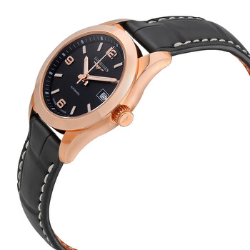 18 carat rose gold case with a black alligator leather strap. Fixed bezel. Black dial with rose gold-tone hands and index-Arabic numerals hour markers. Dial Type: Analog. Luminescent hands and markers. Date display at the 3 o'clock position. Longines Calibre L595/592 automatic movement with about 40 hours of power reserve. Scratch resistant sapphire crystal. Skeleton transparent exhibition see through case back. Case size: 29.50 mm. Round case shape. Water resistant at 50 meters / 165 feet. Functions: date, hour, minute, second. Luxury watch style. Watch label: Swiss Made. Longines Conquest Classic Automatic Ladies Leather Watch L22858563.