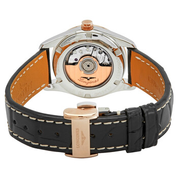 Stainless steel case with a black (alligator) leather strap. Fixed 18kt rose gold bezel. Black dial with luminous rose gold-tone hands and index hour markers. Arabic numerals appear at the 6, 9 and 12 o'clock positions. Minute markers around the outer rim. Dial Type: Analog. Date display at the 3 o'clock position. Longines calibre L595 automatic movement with a 40-hour power reserve. Scratch resistant sapphire crystal. Pull / push crown. Transparent case back. Round case shape. Case size: 29.50 mm. Case thickness: 10,8 mm. Strap width: 20 mm. Fold over clasp. Water resistant at 50 meters / 165 feet. Functions: date, hour, minute, second. Dress watch style. Watch label: Swiss Made. Longines Conquest Classic Automatic Ladies Watch L2.285.5.56.3.