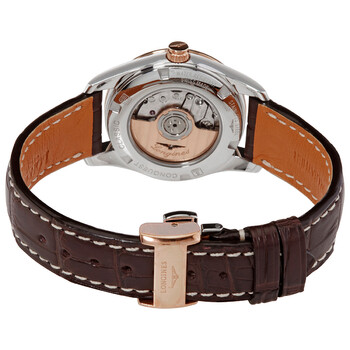 Stainless steel case with a brown (alligator) leather strap. Fixed rose gold PVD bezel. Silver dial with luminous rose gold-tone hands and index hour markers. Arabic numerals appear at the 6, 9 and 12 o'clock positions. Minute markers around the outer rim. Dial Type: Analog. Luminescent hands. Date display at the 3 o'clock position. Longines calibre L595 automatic movement, based upon ETA 2000/1, containing 20 Jewels, bitting at 28800 vph, and has a power reserve of approximately 40 hours. Scratch resistant sapphire crystal. Pull / push crown. Transparent case back. Round case shape, case size: 29.5 mm. Tang clasp. Water resistant at 50 meters / 165 feet. Functions: date, hour, minute, second. Conquest Classic Series. Dress watch style. Watch label: Swiss Made. Longines Conquest Classic Automatic Silver Dial Ladies Watch L2.285.5.76.3.