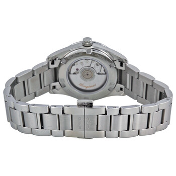 Stainless steel case with a silver-tone stainless steel bracelet. Fixed silver-tone stainless steel bezel. Silver dial with luminous silver-tone hands and index hour markers. Arabic numerals mark the 6, 9 and 12 o'clock positions. Minute markers around the outer rim. Dial Type: Analog. Date display at the 3 o'clock position. Longines Calibre L592.2 automatic movement with a 40-hour power reserve. Scratch resistant sapphire crystal. Pull / push crown. Skeleton case back. Round case shape, case size: 29.8 mm, case thickness: 9.2 mm. Band width: 15 mm. Fold over clasp with a push button release. Water resistant at 30 meters / 100 feet. Functions: date, hour, minute, second. Conquest Classic Series. Dress watch style. Watch label: Swiss Made. Item Variations: L2 285 4 76 6, L2-285-4-76-6, L2/285/4/76/6, L22854766. Longines Conquest Classic Automatic Silver Dial Ladies Watch L22854766.