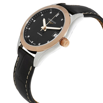 Stainless steel case with a black leather strap. Fixed 18kt rose gold bezel. Black dial with luminous rose gold-tone hands and diamond hour markers. Minute markers around the outer rim. Dial Type: Analog. Date display at the 3 o'clock position. Longines calibre L619 / L888 automatic movement with a 42-hour power reserve. Scratch resistant sapphire crystal. Transparent case back. Case size: 34 mm. Case thickness: 11.5 mm. Round case shape. Band width: 17 mm. Fold over clasp. Water resistant at 50 meters / 165 feet. Functions: date, hour, minute, second. Luxury watch style. Watch label: Swiss Made. Longines Conquest Classic Black Dial Ladies Watch L2.385.5.58.3.