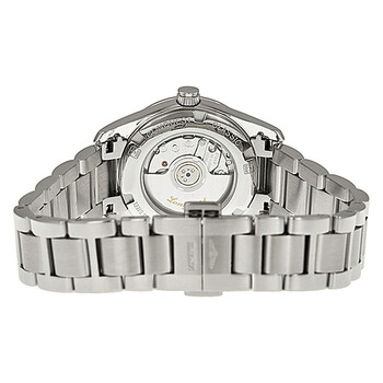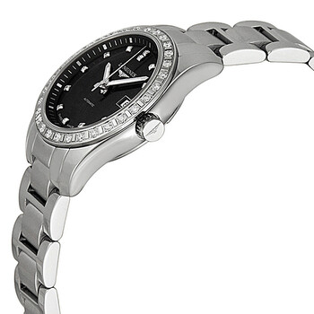 Stainless steel case with a stainless steel bracelet. Fixed silver-tone bezel set with diamonds. Black dial with silver-tone hands and diamond hour markers. Minute markers around the outer rim. Dial Type: Analog. Date display at the 3 o'clock position. Automatic movement with 40 hour power reserve. Scratch resistant sapphire crystal. Pull / push crown. Skeleton case back. Case diameter: 29.5 mm. Round case shape. Deployment clasp. Water resistant at 50 meters / 165 feet. Functions: date, hour, minute, second. Luxury watch style. Longines Conquest Classic Black Dial Stainless Steel Ladies Watch L22850576.