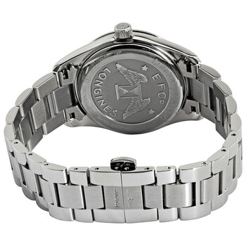 Stainless steel case with a stainless steel bracelet. Fixed stainless steel bezel. Black mother of pearl dial with silver-tone hands and diamond hour markers. Minute markers around the outer rim. Dial Type: Analog. Date display at the 3 o'clock position. Longines calibre 156 quartz movement. Scratch resistant sapphire crystal. Pull / push crown. Solid case back. Round case shape. Case size: 34 mm. Band width: 17 mm. Triple fold over clasp. Water resistant at 50 meters / 165 feet. Functions: date, hour, minute, second. Additional Info: dial set with 11 diamonds (0.055 carats). Dress watch style. Watch label: Swiss Made. Longines Conquest Classic Black Mother of Pearl Diamond Dial Ladies Watch L23864886.