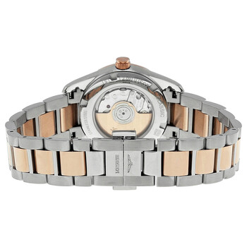 Stainless steel case with a stainless steel bracelet with 18kt rose gold center links. Fixed 18kt rose gold bezel. Mother of pearl dial with luminous rose gold-tone hands and diamond hour markers. Minute markers around the outer rim. Dial Type: Analog. Luminescent hands and markers. Date display at the 3 o'clock position. Longines calibre L595 automatic movement, based upon ETA 2000/1, containing 20 Jewels, bitting at 28800 vph, and has a power reserve of approximately 40 hours. Scratch resistant sapphire crystal. Pull / push crown. Skeleton case back. Round case shape. Case size: 29.5 mm. Band length: 6 inches. Deployment clasp. Water resistant at 50 meters / 165 feet. Functions: date, hour, minute, second. Conquest Classic Series. Dress watch style. Watch label: Swiss Made. Item Variations: L2-285-5-87-7 L2.285.5.87.7. Longines Conquest Classic Mother of Pearl Dial Ladies Watch L2.285.5.87.7.