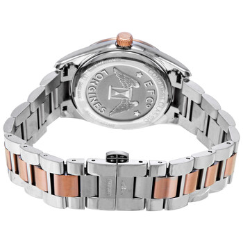 Stainless steel case with a two-tone (silver-tone and rose gold-plated) stainless steel bracelet. Fixed rose gold-plated bezel. Mother of pearl dial with rose gold-tone hands and diamond hour markers. Minute markers around the outer rim. Dial Type: Analog. Date display at the 3 o'clock position. Caliber L156 quartz movement. Scratch resistant sapphire crystal. Pull / push crown. Solid case back. Round case shape. Case size: 34 mm. Case thickness: 8.9 mm. Band width: 17 mm. Fold over clasp with a push button release. Water resistant at 50 meters. Functions: date, hour, minute, second. Conquest Classic Series. Dress watch style. Watch label: Swiss Made. Longines Conquest Classic Quartz Diamond Ladies Watch L2.386.3.87.7.