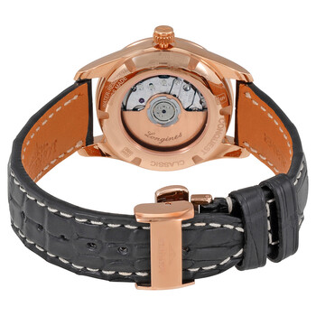 18 carat rose gold case with a black alligator leather strap. Fixed bezel. Silver dial with rose gold-tone hands and index-Arabic numerals hour markers. Dial Type: Analog. Luminescent hands and markers. Date display at the 3 o'clock position. Automatic movement with about 40 hours of power reserve. Scratch resistant sapphire crystal. Skeleton transparent exhibition see through case back. Case size: 29.50 mm. Round case shape. Water resistant at 50 meters / 165 feet. Functions: date, hour, minute, second. Luxury watch style. Watch label: Swiss Made. Longines Conquest Classic Silver Dial Automatic Ladies Watch L22858763.