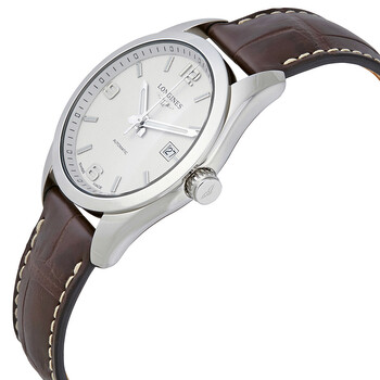 Stainless steel case with a brown leather strap. Fixed silver-tone bezel. Silver dial with luminous silver-tone hands and index hour markers. Arabic numerals mark the 6, 9 and 12 o'clock positions. Minute markers around the outer rim. Dial Type: Analog. Luminescent hands. Date display at the 3 o'clock position. Automatic movement. Scratch resistant sapphire crystal. Transparent case back. Case size: 40 mm. Case thickness: 10 mm. Round case shape. Fold over with push button release clasp. Water resistant at 50 meters / 165 feet. Casual watch style. Longines Conquest Classic Silver Dial Men's Watch L27854765.