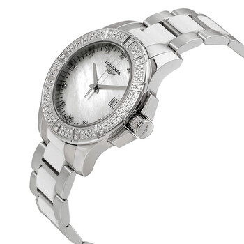 Stainless steel case with a stainless steel bracelet with white ceramic center links. Fixed stainless steel diamond-set bezel. Mother of pearl dial with silver-tone hands and diamond hour markers. Minute markers around the outer rim. Dial Type: Analog. Date display at the 3 o'clock position. Quartz movement. Scratch resistant sapphire crystal. Pull / push crown. Solid case back. Case size: 35 mm. Case thickness: 9 mm. Round case shape. Band width: 17 mm. Deployment clasp. Water resistant at 50 meters / 165 feet. Functions: date, hour, minute, second. Luxury watch style. Watch label: Swiss Made. Longines Conquest Mother of Pearl Dial Diamond Ladies Watch L3.280.0.87.7.