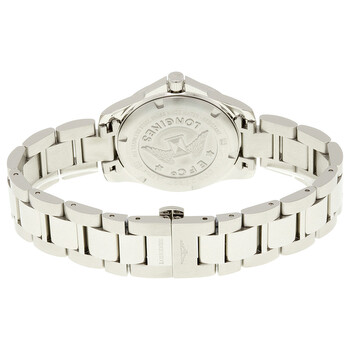 Stainless steel case with a stainless steel bracelet. Fixed stainless steel bezel. Mother of pearl dial with silver-tone hands and diamond hour markers. Minute markers around the outer rim. Dial Type: Analog. Date display at the 3 o'clock position. Quartz movement. Scratch resistant sapphire crystal. Case size: 36 mm. Case thickness: 9.20 mm. Round case shape. Deployment clasp. Water resistant at 300 meters / 1000 feet. Functions: date, hour, minute, second. Luxury watch style. Watch label: Swiss Made. Longines Conquest Mother of Pearl Dial Diamond Ladies Watch L3.378.4.87.6.