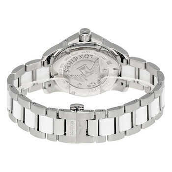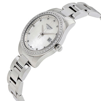 Stainless steel case with a stainless steel bracelet. Fixed stainless steel bezel set with diamonds. Mother of pearl dial with silver-tone hands and diamond hour markers. Minute markers around the outer rim. Dial Type: Analog. Date display at the 3 o'clock position. Quartz movement. Scratch resistant sapphire crystal. Case size: 36 mm. Case thickness: 9 mm. Round case shape. Deployment clasp. Water resistant at 300 meters / 1000 feet. Functions: date, hour, minute, second. Luxury watch style. Watch label: Swiss Made. Longines Conquest Mother of Pearl Dial Diamond Ladies Watch L3.401.0.87.6.