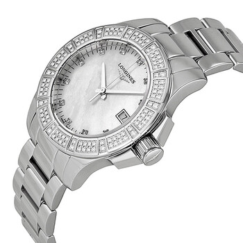 Stainless steel case with a stainless steel bracelet. Fixed silver-tone bezel set with diamonds. Mother of pearl dial with silver-tone hands and diamond hour markers. Minute markers around the outer rim. Dial Type: Analog. Date display at the 3 o'clock position. Quartz movement. L263 engine. Scratch resistant sapphire crystal. Pull / push crown. Solid case back. Case diameter: 35 mm. Round case shape. Fold over with safety release clasp. Water resistant at 50 meters / 165 feet. Functions: date, hour, minute, second. Dress watch style. Longines Conquest Mother of Pearl Dial Stainless Steel Ladies Watch L32800876.