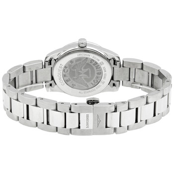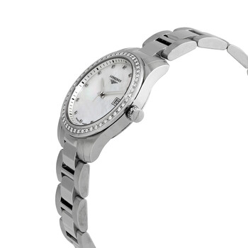 Stainless steel case with a stainless steel bracelet. Fixed stainless steel bezel set with diamonds. Mother of pearl dial with silver-tone hands and diamond hour markers. Minute markers around the outer rim. Dial Type: Analog. Date display at the 3 o'clock position. ETA Caliber 255.412 quartz movement. Scratch resistant sapphire crystal. Screw down crown. Solid case back. Round case shape. Case size: 34 mm. Band width: 17 mm. Deployment clasp. Water resistant at 30 meters / 100 feet. Functions: date, hour, minute, second. Conquest Series. Dress watch style. Watch label: Swiss Made. Longines Conquest Mother of Pearl Diamond Stainless Steel Ladies Watch L34000876.