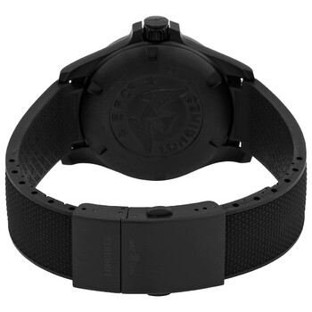 Black- coated PVD case with a black rubber strap. Fixed bezel. Black dial with black hands and index-Arabic numerals hour markers. Minute scale around the inner rim. Dial Type: Analog. Luminescent hands and markers. Date display at the 3 o'clock position. Quartz movement. Scratch resistant sapphire crystal. Solid case back. Round case shape, case size: 41 mm. Band width: 20 mm. Folding clasp. Water resistant at 50 meters / 164 feet. Functions: date, hour, minute, second. Conquest Series. Dress watch style. Watch label: Swiss Made. Longines Conquest Quartz Black Dial Men's Watch L3.716.2.56.9.