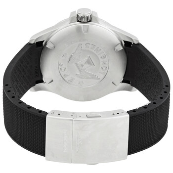 Silver-tone stainless steel case with a black rubber strap. Fixed bezel. Black dial with silver-tone hands and index-Arabic numerals hour markers. Dial Type: Analog. Luminescent hands and markers. Date display at the 3 o'clock position. Quartz movement. Scratch resistant sapphire crystal. Pull / push crown. Solid case back. Round case shape, case size: 43 mm. Push button folding clasp. Water resistant at 50 meters / 164 feet. Functions: date, hour, minute, second. Conquest Series. Dress watch style. Watch label: Swiss Made. Longines Conquest Quartz Black Dial Men's Watch L3.728.4.56.9.