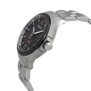 Stainless steel case with a stainless steel bracelet. Fixed black ceramic bezel. Black dial with luminous silver-tone hands and index hour markers. Arabic numerals appear at the 6 and 12 o'clock positions. Minute markers around the outer rim. Dial Type: Analog. Luminescent hands and markers. Date display at the 3 o'clock position. Longines calibre L288 quartz movement. Scratch resistant sapphire crystal. Screw down crown. Solid case back. Round case shape. Case size: 43 mm. Band width: 22 mm. Fold over clasp. Water resistant at 50 meters / 165 feet. Functions: date, hour, minute, second. Conquest Series. Luxury watch style. Watch label: Swiss Made. Longines Conquest Quartz Black Dial Men's Watch L37294566.