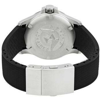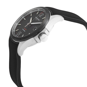 Stainless steel case with a black rubber strap. Fixed black ceramic bezel. Black dial with luminous black hands and index hour markers. Arabic numeraals appear at the 6 and 12 o'clock positions. Arabic numeral minute markers (at 5 minute intervals). Minute markers around the outer rim. Dial Type: Analog. Luminescent hands and markers. Date display at the 3 o'clock position. Longines Calibre L288 quartz movement. Scratch resistant sapphire crystal. Screw down crown. Transparent case back. Round case shape. Case size: 43 mm. Band width: 22 mm. Deployment clasp with a push button release. Water resistant at 50 meters / 165 feet. Functions: date, hour, minute, second. Conquest Series. Luxury watch style. Watch label: Swiss Made. Longines Conquest Quartz Black Dial Men's Watch L37294569.