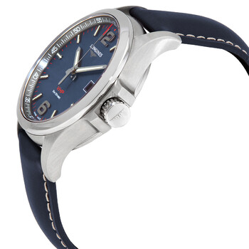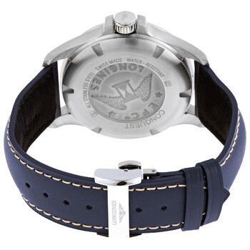 Stainless steel case with a blue leather strap. Fixed stainless steel bezel. Blue dial with luminous grey hands and index hour markers. Arabic numerals appear at the 6 and 12 o'clock positions. Arabic numeral minute markers (at 5 minute intervals). Minute markers around the outer rim. Dial Type: Analog. Luminescent hands and markers. Date display at the 3 o'clock position. Longines calibre L288 quartz movement. Scratch resistant sapphire crystal. Pull / push crown. Solid case back. Round case shape. Case size: 43 mm. Case thickness: 11.8 mm. Band width: 21 mm. Tang clasp. Water resistant at 50 meters / 165 feet. Functions: date, hour, minute, second. Conquest Series. Casual watch style. Watch label: Swiss Made. Longines Conquest Quartz Blue Dial Men's Watch L3.726.4.96.0.