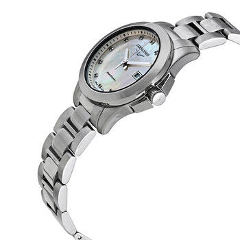 Stainless steel case with a stainless steel bracelet. Fixed stainless steel bezel. Mother of pearl dial with silver-tone hands and diamond hour markers. Minute markers around the outer rim. Dial Type: Analog. Date display at the 3 o'clock position. Longines calibre L152 quartz movement. Scratch resistant sapphire crystal. Screw down crown. Solid case back. Round case shape. Case size: 29.5 mm. Case thickness: 9.4 mm. Band width: 15 mm. Fold over clasp with a push button release. Water resistant at 300 meters / 1000 feet. Functions: date, hour, minute, second. Additional Info: dial set with 11 diamonds (0.036 cts). Conquest Series. Dress watch style. Watch label: Swiss Made. Longines Conquest Quartz Diamond Ladies Watch L3.376.4.87.6.
