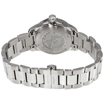 Stainless steel case and bracelet. Fixed stainless steel bezel. White dial with index hour markers. Arabic numerals appear at the 6 and 12 o'clock positions. Minute markers around the outer rim. Dial Type: Analog. Date display at the 3 o'clock position. Moonphase display. Longines calibre L296 quartz movement. Scratch resistant sapphire crystal. Screw down crown. Solid case back. Round case shape. Case size: 29.50 mm. Case thickness: 12 mm. Band width: 15 mm. Fold over clasp with a push button release. Water resistant at 300 meters / 1000 feet. Functions: date, hour, minute, second, moonphase. Conquest Series. Dress watch style. Watch label: Swiss Made. Longines Conquest Quartz White Dial Ladies Watch L33804166.