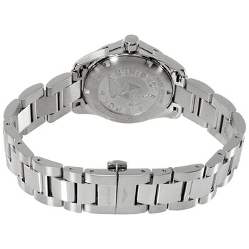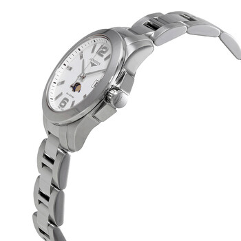 Stainless steel case witrh a stainless steel bracelet. Fixed stainless steel bezel. White dial with index hour markers. Minute markers around the outer rim. Dial Type: Analog. Date display at the 3 o'clock position. Moonphase display. ETA caliber E63.171 quartz movement. Scratch resistant sapphire crystal. Screw down crown. Solid case back. Round case shape. Case size: 34 mm. Fold over clasp with a push button release. Water resistant at 300 meters / 1000 feet. Functions: date, hour, minute, second, moonphase. Conquest Series. Dive watch style. Watch label: Swiss Made. Longines Conquest Quartz White Dial Ladies Watch L33814166.