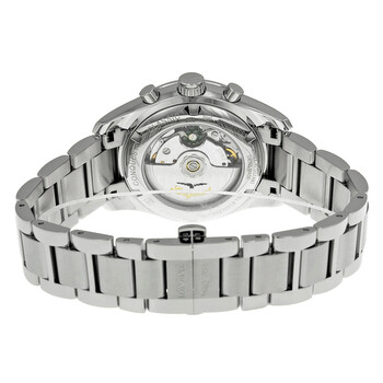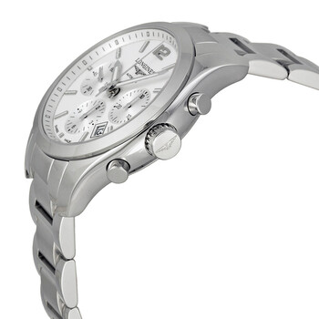 Stainless steel case with a stainless steel bracelet. Fixed stainless steel bezel. Silver dial with luminous hands and index hour markers. Minute markers around the outer rim. Dial Type: Analog. Date display between the 4 and 5 o'clock positions. Chronograph - three sub-dials displaying: 60 second, 30 minute and 12 hour. Automatic movement with a 54 hour power reserve. Scratch resistant sapphire crystal. Push / pull crown. Skeleton case back. Case diameter: 41 mm. Case thickness: 14 mm. Round case shape. Bracelet width: 20 mm. Deployment clasp. Functions: chronograph, date, hour, minute, second. Dress watch style. Longines Conquest Silver Dial Chronograph Stainless Steel Men's Watch L27864766.