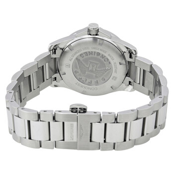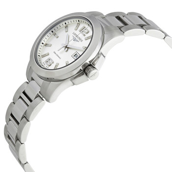 Stainless steel case with a stainless steel bracelet. Fixed stainless steel bezel. Silver dial with silver-tone hands and index hour markers. Arabic numerals mark the 6 and 12 o'clock positions. Minute markers around the outer rim. Dial Type: Analog. Date display at the 3 o'clock position. Longines calibre L152 quartz movement. Scratch resistant sapphire crystal. Screw down crown. Solid case back. Case size: 29.5 mm. Case thickness: 15 mm. Round case shape. Fold over deployment clasp. Water resistant at 300 meters / 1000 feet. Functions: date, hour, minute, second, end of life feature. Dive watch style. Watch label: Swiss Made. Longines Conquest Silver Dial Ladies Watch L33764766
