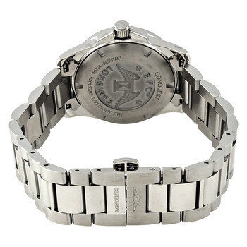 Stainless steel case with a stainless steel bracelet. Fixed stainless steel bezel. Sunray blue dial with luminous silver-tone hands and index hour markers. Arabic numerals mark the 6 and 12 o'clock positions. Minute markers around the outer rim. Dial Type: Analog. Luminescent hands and markers. Date display at the 3 o'clock position. Longines calibre L152 quartz movement. Scratch resistant sapphire crystal. Screw down crown. Solid case back. Round case shape. Case size: 29.50 mm. Case thickness: 9 mm. Fold over clasp. Water resistant at 300 meters / 1000 feet. Functions: date, hour, minute, second. Casual watch style. Watch label: Swiss Made. Longines Conquest Sunray Blue Dial Ladies Watch L3.376.4.96.6.