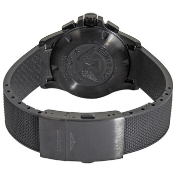 Black PVD stainless steel case with a black rubber strap. Fixed black PVD bezel. Carbon fiber dial with luminous black hands and index hour markers. An Arabic numerals appear at the 12 o'clock position. Minute markers around the outer rim. Dial Type: Analog. Luminescent hands and markers. Date display between the 4 and 5 o'clock positions. Chronograph - three sub-dials displaying: 60 second, 30 minute and 12 hour. Longines calibre L289.2 quartz movement. Scratch resistant sapphire crystal. Pull / push crown. Solid case back. Round case shape. Case size: 42 mm. Band width: 21 mm. Fold over clasp with a safety release. Water resistant at 50 meters / 165 feet. Functions: perpetual calendar, date, hour, minute, second, battery eol indicator, shock resistant, magnetic resistant. Conquest V.h.p Series. Sport watch style. Watch label: Swiss Made. Longines Conquest V.H.P Carbon Fiber Dial Men's Watch L37172669.
