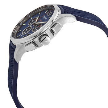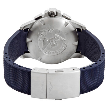 Silver-tone stainless steel case with a blue rubber strap. Fixed silver-tone stainless steel bezel. Blue dial with luminous black hands and index hour markers. Arabic numeral appears at the 12 o'clock position. Minute markers around the outer rim. Dial Type: Analog. Luminescent hands and markers. Date display between the 4 and 5 o'clock positions. Chronograph - three sub-dials displaying: 60 second, 30 minute and 12 hours. Longines Calibre L289 quartz movement. Scratch resistant sapphire crystal. Pull / push crown. Solid case back. Round case shape, case size: 44 mm, case thickness: 12.50 mm. Band width: 22 mm. Fold over clasp with a push button release. Water resistant at 50 meters / 165 feet. Functions: chronograph, date, hour, minute, second. Conquest V.h.p. Series. Dress watch style. Watch label: Swiss Made. Longines Conquest V.H.P. Chronograph Quartz Blue Dial Men's Watch L3.727.4.96.9.